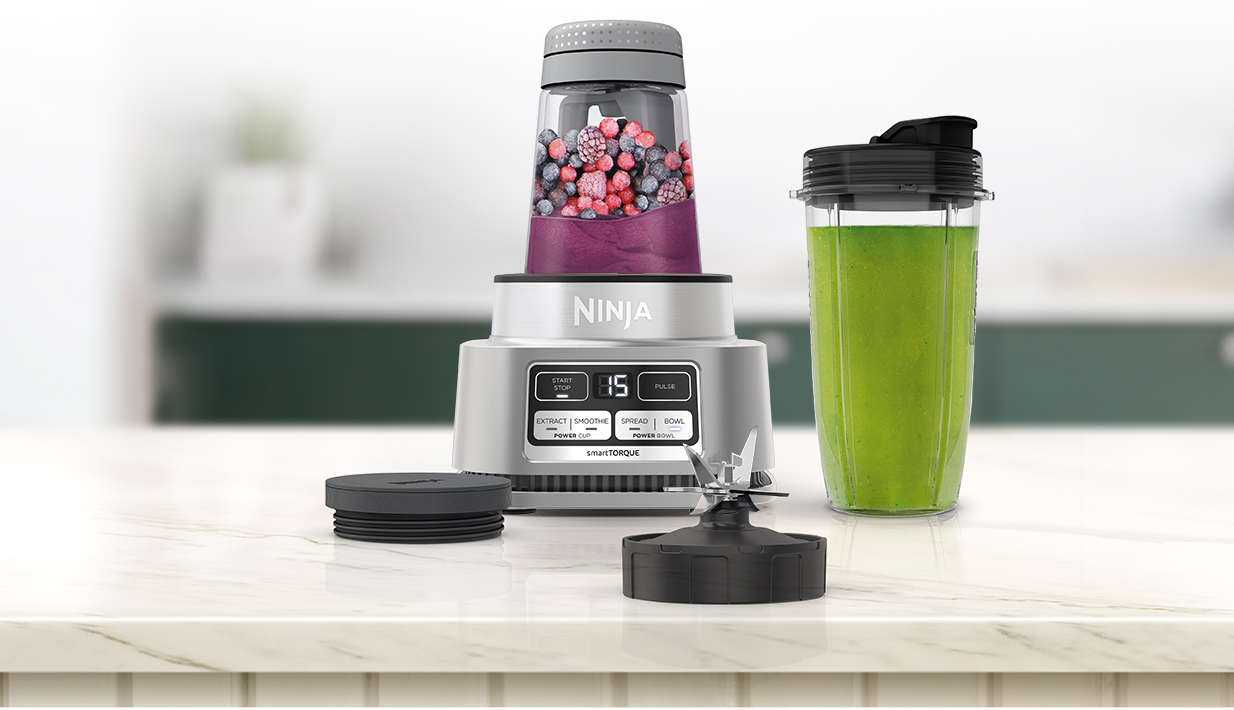 The Ninja Foodi Power Nutri Compact System with smartTORQUE is designed to power through the thickest ingredients at high speed and never stall. One base with multi-functions. Use the Power Nutri™ Cup with spout lid for smoothies and extractions. The Power Nutri Bowl with Power Paddle powers through frozen foods with less liquid for thick smoothie bowls and nut butters. 1100-watt power-dense motor.