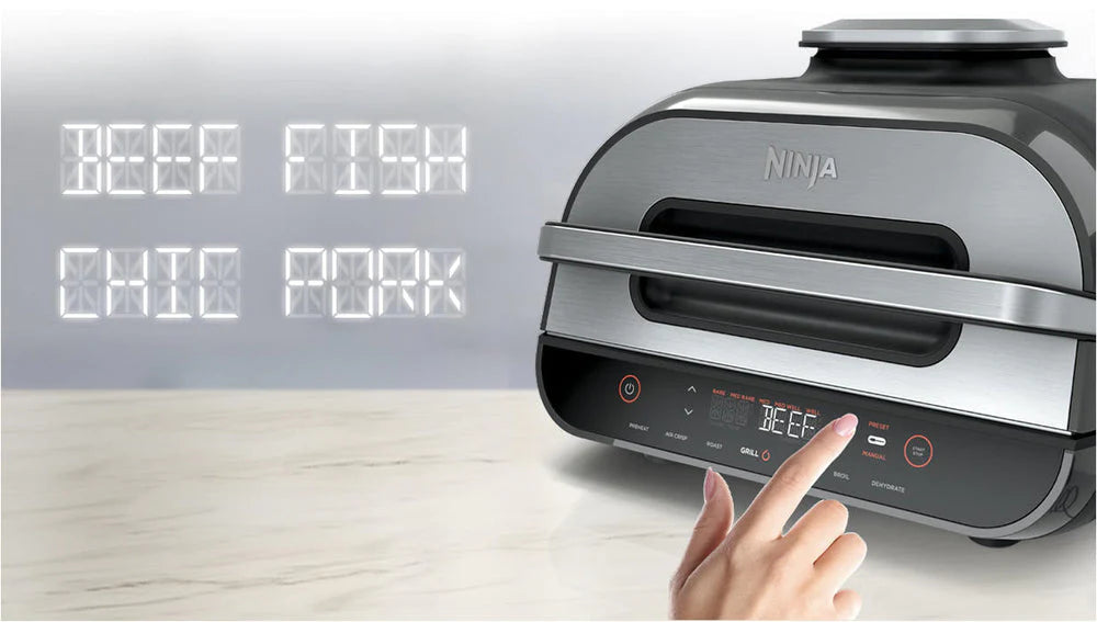 The Ninja Foodi Smart XL Grill that sears, sizzles, and air fry crisps. With the innovative Smart Cook System and XL capacity, acheive the perfect doneness from rare to well done on family‑sized meals at the touch of a button.